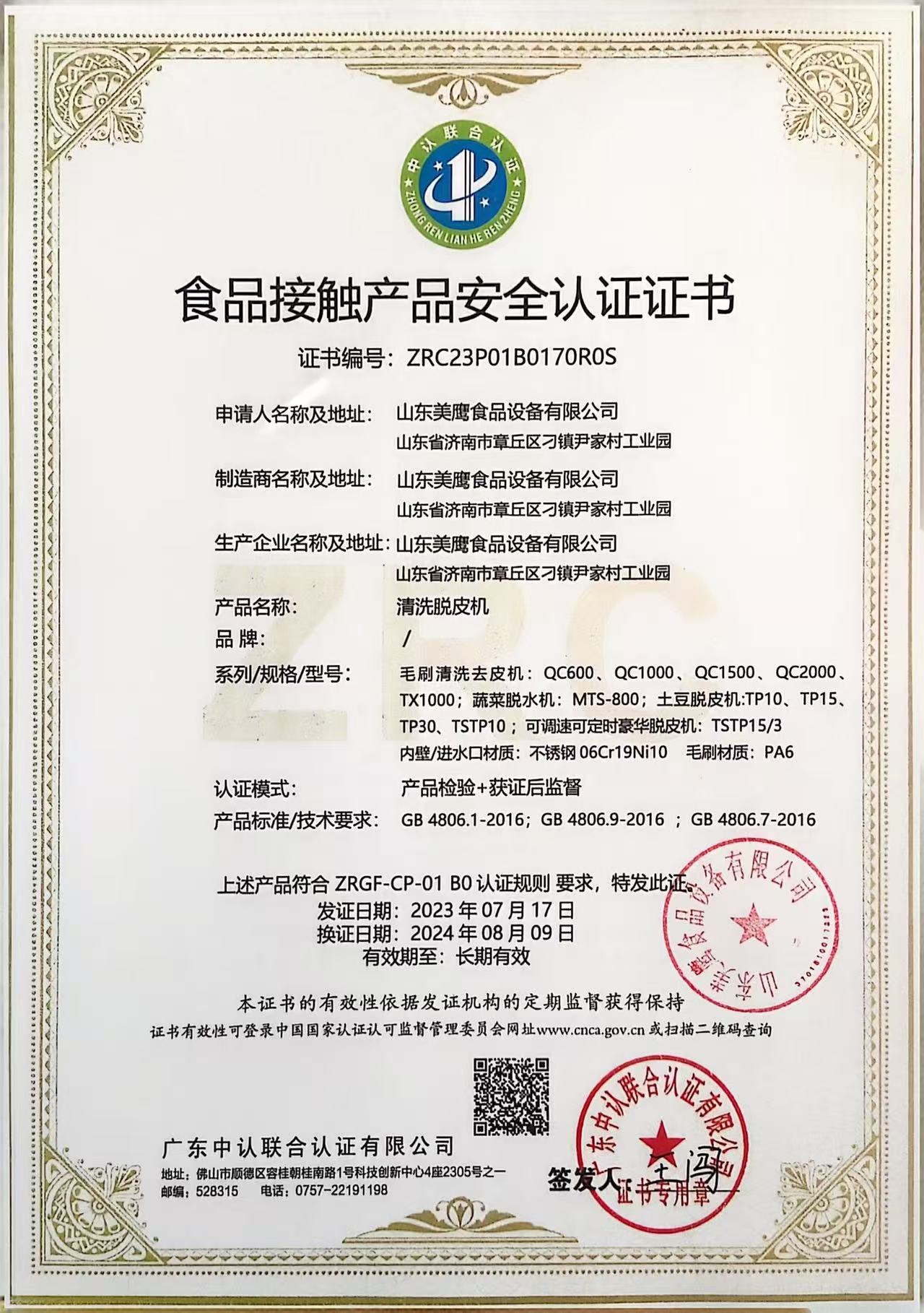 食品接觸產(chǎn)品安全認證證書
